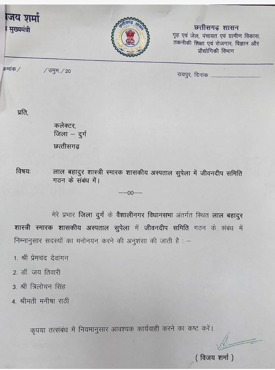 शासकीय अस्पताल सुपेला जीवन दीप समिति का गठन, डॉ. : डॉ. जय, प्रेमचंद, त्रिलोचन और मनीषा सदस्य नियुक्त
