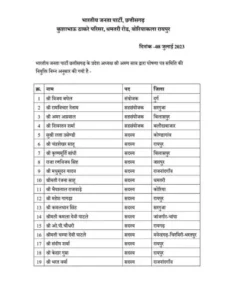 रायपुर 8 जुलाई 2023:- विधानसभा चुनाव की पूर्व लोकसभा सांसद विजय बघेल को भाजपा संगठन में महत्वपूर्ण जिम्मेदारी सौंपी है चुनाव के पूर्व संगठन में विजय बघेल का बढ गया है छत्तीसगढ़ प्रदेश भारतीय जनता पार्टी ने विधानसभा चुनाव की तैयारी प्रारंभ कर दी है इसी परिपेक्ष में भाजपा प्रदेश अध्यक्ष अरुण साव की सहमति से महामंत्री संगठन केदार कश्यप ने दुर्ग लोकसभा सांसद विजय बघेल को 31 सदस्यी घोषणा पत्र समिति का संयोजक बनाया है छत्तीसगढ़ में चुनाव नजदीक है। ऐसे में हर राजनितिक पार्टियां अपनी तरफ से तैयारियों में जुट चुकी है। भाजपा ने चुनाव प्रभारी के ऐलान के बाद घोषणा पत्र समिति की भी घोषणा कर दी है। दुर्ग सांसद विजय बघेल को घोषणा पत्र समिति का संयोजक बनाया गया है, वहीं रामविचार नेताम, अमर अग्रवाल, शिवरतन शर्मा, सह संयोजक बनाये गये हैं