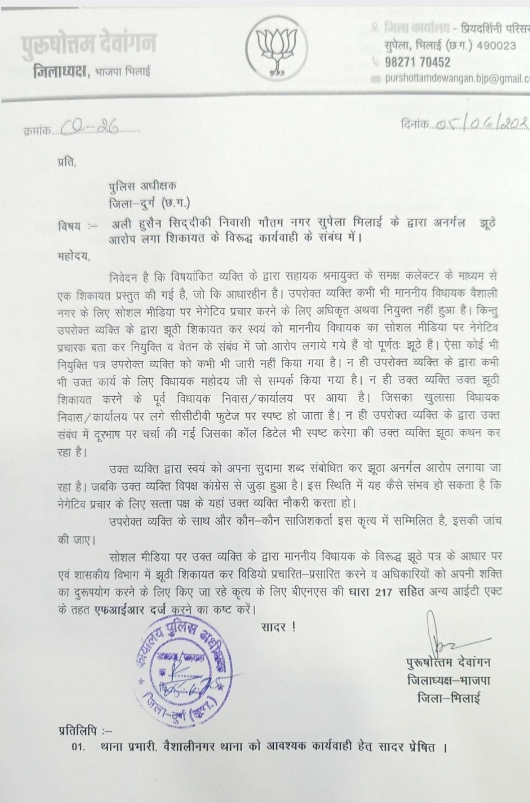 अली हुसैन सिद्दीकी के खिलाफ अपराध पंजीबद्ध करने का आग्रह किया है। : भिलाई जिला भाजपा अध्यक्ष की एसएसपी दुर्ग से शिकायत, कांग्रेस अली हुसैन पर दर्ज हो फिर